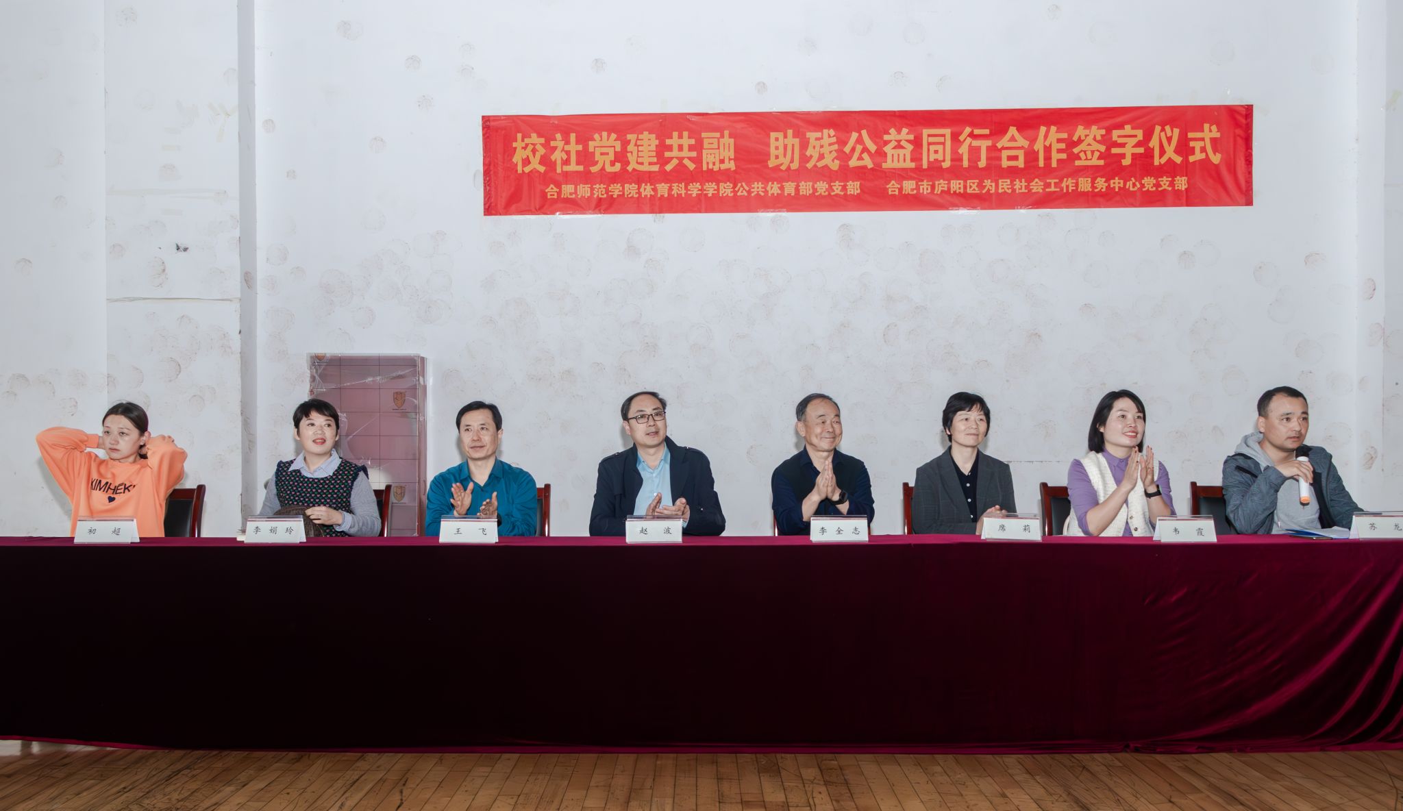 本网讯 播下一粒种子,收获一片生机;献出一颗爱心,托起一份希望。10月25日下午,中文字幕日韩公共体育部党支部和合肥市庐阳区为民社会工作服务中心党支部“校社党建共融 助残公益同行”公益活动暨合作签约揭牌仪式在学校锦绣校区体育馆举行。中文字幕日韩党委书记赵波、党委副书记王飞、副院长席莉出席,合肥市庐阳区为民社会工作服务中心党支部书记李全志、中心老师和孩子们及部分家长代表,公共体育部党支部全体教师党员及各系部师生代表近百人参加。仪式由公共体育部党支部组织委员苏龙主持。