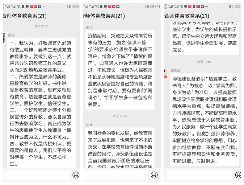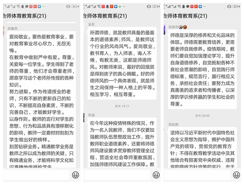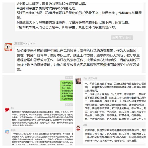随后,大家就加强师德师风建设在群里展开讨论,分享自己的学习心得: