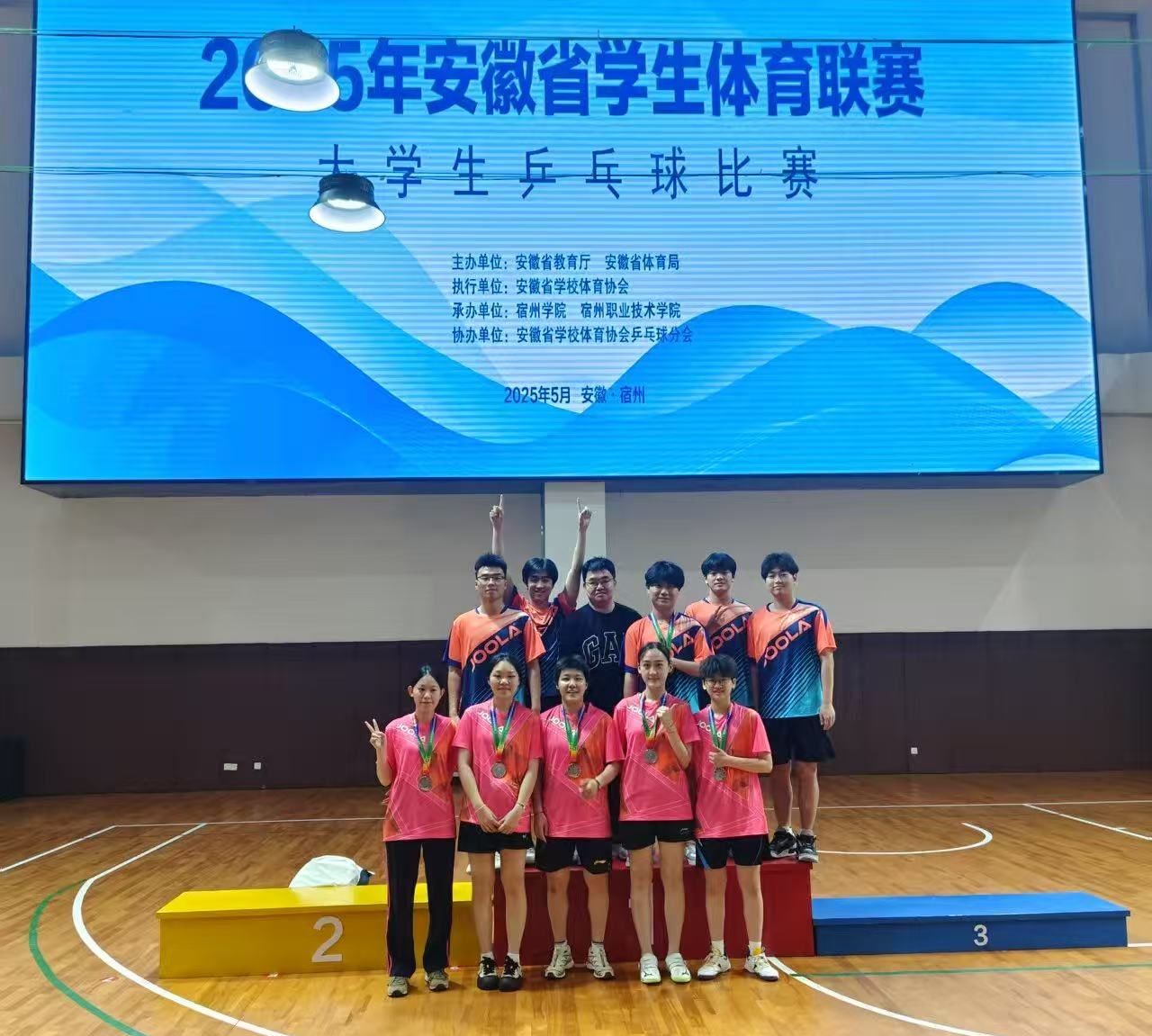 5月22日-29日,由省教育厅、省体育局联合主办,宿州学院、宿州职业技术学院承办的2025年安徽省学生体育联赛大学生乒乓球比赛在宿州职业技术学院举行。本次赛事吸引了来自全省高校的64支代表队、600余名教练员和运动员参加。学院乒乓球队由殷冉教练带队参加,收获2金3银3铜的成绩。