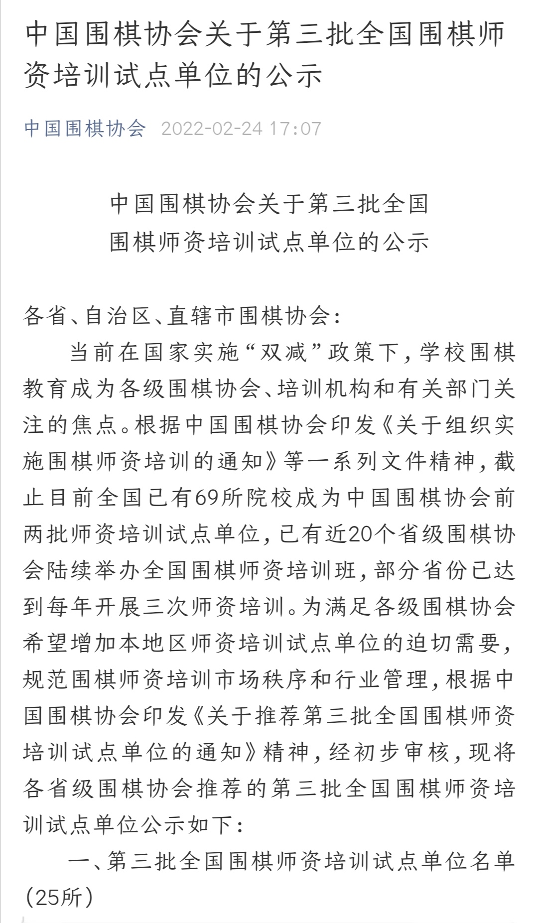 本网讯 近日,中国围棋协会发布《中国围棋协会关于第三批全国围棋师资培训试点单位的公示》,我院获批第三批全国围棋师资培训试点单位。本次试点单位涉及全国16个省25所院校,我院是安徽省唯一一所入选高校。