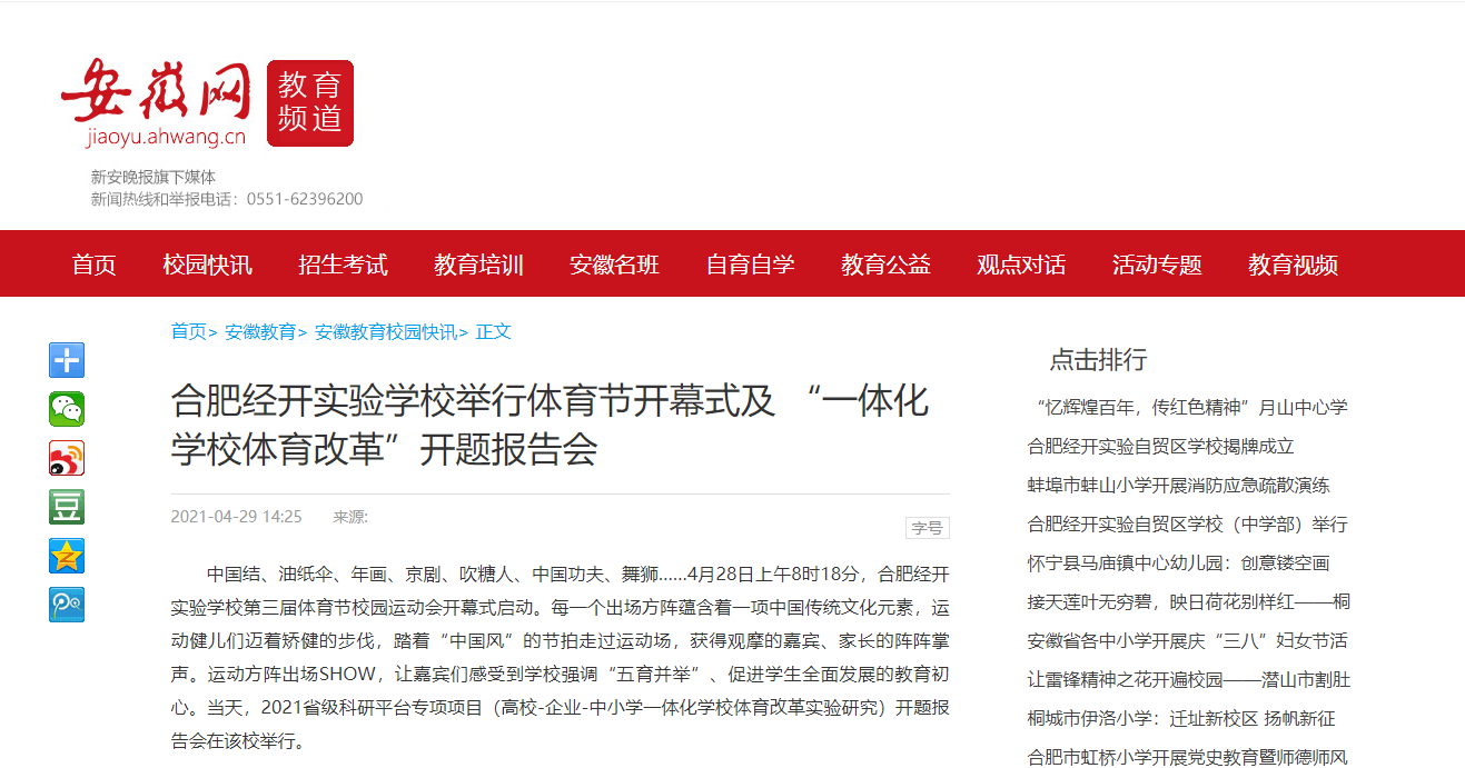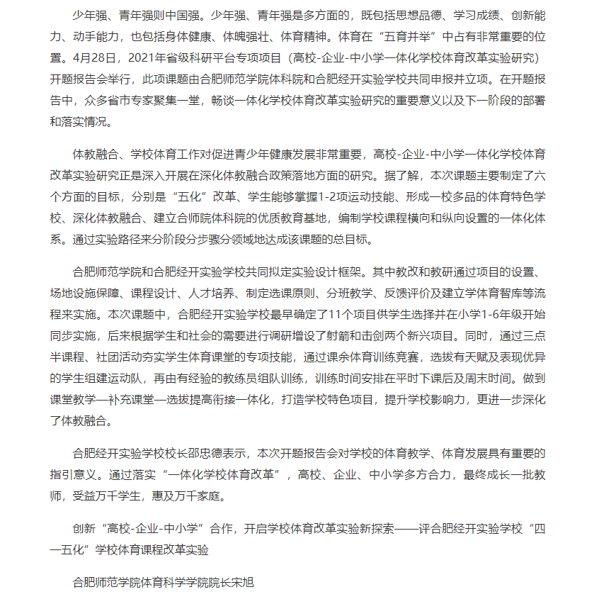 本网讯 少年强、青年强则中国强。少年强、青年强是多方面的,既包括思想品德、学习成绩、创新能力、动手能力,也包括身体健康、体魄强壮、体育精神。体育在“五育并举”中占有非常重要的位置。4月28日上午,2021年省级科研平台专项项目(高校-企业-中小学一体化学校体育改革实验研究)开题报告会在合肥经开区实验学校举行,此项课题由合肥师范学院中文字幕日韩和合肥经开实验学校共同申报并立项。
