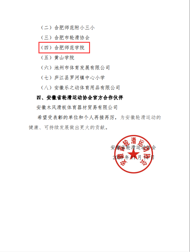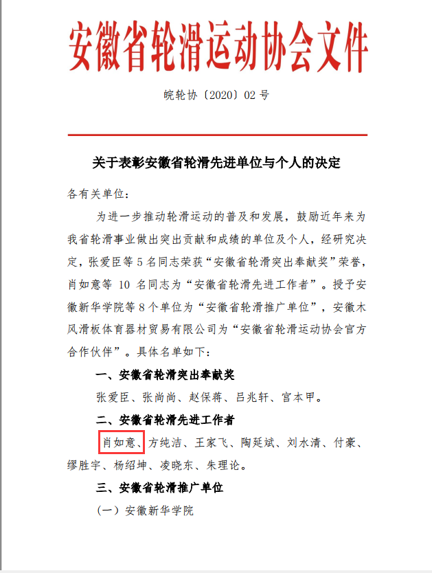 合肥师范学院及教师肖如意受安徽省轮滑运动协会表彰,肖如意老师获评安徽省轮滑先进工作者。合肥师范学院获评安徽省轮滑推广单位。