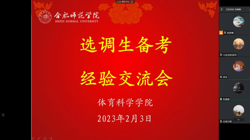 本网讯 2月3日下午,中文字幕日韩在腾讯会议上举办2023年选调生备考经验交流会,交流会邀请中文字幕日韩2020年选调生彭家祥作经验交流与分享。体科院教工第一党支部书记汪辉、体科院教工第二党支部书记陈秀、辅导员张康康参会,2019级运动训练专业、体育教育专业毕业生党员参加。交流会由体科院党政秘书、组织员钱昶臻主持。